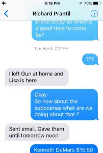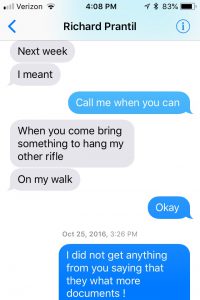 Ms. Damiani mentions I have many guns which is true. I am a retired Navy SEAL. As you can see from the Text message’s from Mr. Prantil. He has a gun hanging in his office. He also told me not to bring the guns that I cleaned for him because Lisa is there. He’s referring to Lisa Damiani.